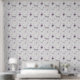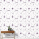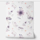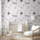 白い背景に紫色の花と弓が描かれた可愛い壁紙。女の子の部屋と子供部屋に最適 – Kate Eden Art
