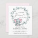 タイポグラフィと台本の混書合フレンドリー「甘い小さなピーナッツが彼女の道にある」とユーカリの緑のリースのパステルピンクのベビー象の水色の混合モダンでスタイリッシュす可愛い予算の赤ちゃん女の子のカップルのシャワー招待。親の名前とシャワー詳細を追加シンプルタイポグラフィ。