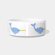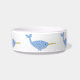 この素晴らしいペットボウルは、かわいい魔法の青い赤ちゃんイルカのデジタルアート画像を特徴としています。イルカの本体はざらざらした質感で青く、お腹は灰青色です。イルカは黒い目に白い瞳があり、顔に輝く金色の角があります。また、繊細な尾とひれがあります。