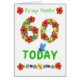 A、かわいらしフローラ60th誕生日カードお母様。数字は花で構成され、文字の上に青い蝶が止まっている。このデザインはJudy Adamsonの手色彩の鮮やか型紙コラージュから提供され、フロントカードとしてもカスタム利用できる。必要に応じて内側の文字もしを編集できる。