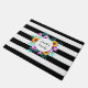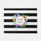 黒と白の背景にフローラ水色リースを持つ美しいストライプのdoormat。多くのカスタマイズ素晴らしいフォントから選んで文字を。