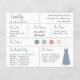 くすみブルーのブライドメイド情報カード。結婚式の日付と場所、結婚式の色、ブライズパーティー、ブライドメイドのドレス、ブライドメイドへの提案メッセージが含まれています。左上隅には、くすみブルーの手書きスクリプトでブライドメイドの名前が書かれています。右下隅には、くすみブルーのドレスがあります。中央には、結婚式の色が円で表示されています。結婚式のドレスの色を含め、色を変更できます。