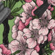 さくらんぼの花と《鳥》アメリカゴガラの鳥の枝を持つ手書きのベクトルのパターン