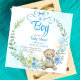 それは男の子テディベアフローラアーチ赤ちゃんシャワー招待テンプレートだ。女の子の赤ちゃんシャワーのための青いリボンとピンクのバルーンと可愛いテディベア。