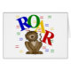 ライオンのテーマのTシャツ、マグ、mousepads、ステッカー、ボタンの"とどろき"を読む明るい多彩の原色の文字とのかわいいライオンのデザイン、および多く。