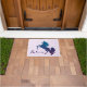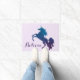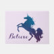 美しい紫色および青い養育ユニコーンを特色にするドア・マット。 イメージは非常に薄紫の背景で置かれます。 文字は置かれます"粋なフォントを使用して一致の紫色で信じます"。