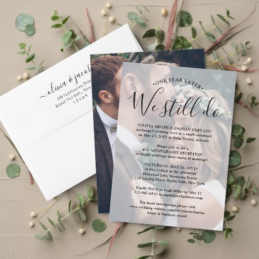 予期しもしない状況があなたの結婚式のレセプションの延期を引き起こし、1年後には祝完璧な機会である。招待状の家族と友人エレガントは、QRコードRSVPとスタイリッシュ2モダン写真オールインワンの招待と単純な1周年記念パーティーに。すべての言葉シンプルは、「1年後も私た読ちはまだ行う」という引用文を含むパーソナライズするである。 カスタマイズ式と記念のパーティーの間の時間は何の時間も含め結婚、わずか数ヶ月か数年の間に。結婚日、誓の更新計画、落書き後のパーティーの詳細、シークェルの式場結婚所、ドレスコードなど、任意の情報を含む(画像の配置のヒント:写真を中心に正確に撮影する簡単方法は、Zazzleウェブサイトにアップロードする前にそれをトリミングする)。 QRコードを携帯電話でスキャンすることにより、ゲストは招待に応答するため結婚にウェブサイトに直接送信される。オンラインのrsvpプロセス減らは、カードがメールに失った入る可能性がある。また、食事の選択、食物アレルギー、曲の要求など頼の詳細な情報を得ることができるように、より汎用性が高い。すべてのレスポンス情報を削除カスタマイズすることができる。ミニマモダンリストの白黒デザインは、カップルの2つの写真、トレンディー手書き文字の書道、シックなタイプライターのスタイルタイポグラフィを備えている。あなたがパーティーが始まる後も幸いなことに、あなたがのパンデミックのために駆け落ちしたか、より小さく、より親密なミニマルまたはマイクロにダウンサイズされた結婚か。新郎新婦おめでとう!