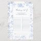 このエレガントなウェディングAからZのゲームシートで、あなたのブライダルシャワーに永遠の魅力を追加し、私たちのブルートイルブライダルシャワースイートとコーディネートするように設計。インスパイアクラシックトイルフランスの・ド・ジュイのパターンにより、このカードは洗練された「何かブルー」お祝いのための繊細なブルー花模様とヴィンテージスタイリングを備えている。「通路」か結婚ら「ジッパー!」まで、アルファベットの文字ごとに自分のテーマの言葉を詰め込み、笑い声や会話、思い出に残る記念の品を作り出す。ガーデンパーティー、お茶のシャワー、または集フォーマル会に最適な、このゲームカードはあなたのブライダルシャワー活動に洗練されたtouchを追加する。