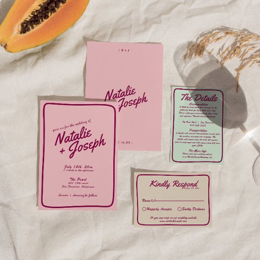 シンプルレトロスタイリッシュカラフル結婚のゲスト情報詳細緑のファンキー背景とブルゴーニュの文字レイアウトを使用。すべての情報は、ウェブサイト、交通、宿泊施設としてカスタマイズ可能である。この上品な手作りのレトロなスイートの他の製品と一緒に結婚それを掴む。