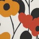 赤とオレンジの鮮やか花を様式化した花の模様が特徴で、それぞれの花の中心が黒はっきりしたくなっている。花は薄い黒い茎とで結ばれ、すべて軽い背景に置かれる。このデザインミニマルは今でも印象的で、きれいな線と対照的な色でレトロモダンか中世紀的な美意識を呼び起こしている。