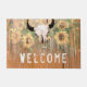 sunflowers西素朴ロデオ牛の牛のスカルと角のフローラ国のテクスチャプリント屋内の屋外の歓迎doormat。バーンドウッドヴィンテージ茶色の黄色の緑の色。カスタムファームハウス女性のカーボーイスタイルデザイン。Image copyright Marg Seregelyi Photography.