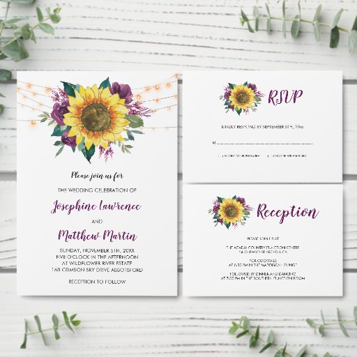 これらの日付カードを除き、素朴なヒマワリと紫の梅のバラのデザインを備えている文字列ライト。コレクションの一部で、一致する結婚式招待状や文房具が揃っている。お客様のニーズに合わせてカスタマイズできるアイテムの全範囲を確認するには、当店を訪問し結婚てください。