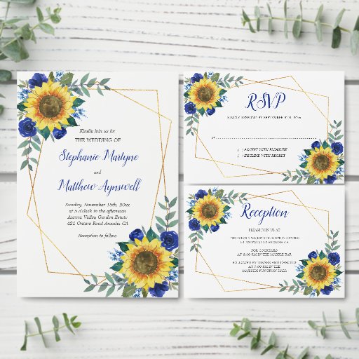 水彩結婚式招待状は、水彩フローラひまわりデザインと金ゴールド幾何学模様の青いバラの葉を特徴とすフェイクる。自分の文字でパーソナライズ。お客様のニーズに合わせてカスタマイズできる様々な製品をご覧いただくために、当店を訪問し結婚てください。