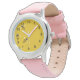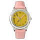 黒い点によって囲まれる編まれた黄色い背景で飛んでいる3匹のおもしろいな漫画の蜂。 楽しい時をこの非常にかわいい腕時計との時間を渡すことを過して下さい!