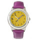 黒い点によって囲まれる編まれた黄色い背景で飛んでいる3匹のおもしろいな漫画の蜂。 楽しい時をこの非常にかわいい腕時計との時間を渡すことを過して下さい!
