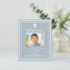 白い枠と白いクロスでほこりっぽい青い背景をパーソナライズし、写真の名前と詳細を追加。白文字。1枚= 1枚の招待状を印刷したエッジからエッジ