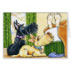 オリジナルのインクと色鉛筆のイラストレーション"アップまだ?"から。ブラック/ブリンドルとホエテンのスコッティは、上のベッドで彼らの所有者からの移動を期待して時計。(c)2014アンディ。