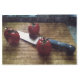料理人のナイフを取り囲む切り板に3個の赤いトマトを載せた水色のスタイル画像。良い祝庭収穫だ。