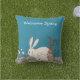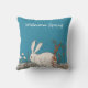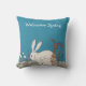 背の高いオレンジと白い花に囲まれた灰色の地面に座っかわいらして、深いの青い背景に白い毛の生えたウサギを持つ家の装飾のための屋外の枕。カスタマイズテンプレートのウェルカム春文字。