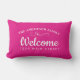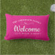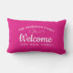 単エレガントにスタイリッシュ腰部装飾用クッションこのデザインモダンは、ホットピンク色の背景に白い「ようこそ」のスクリプト文字を備え、変更することができ、家族の姓モノグラムとあなたの通りアドレスとパーソナライズされた一緒に。前面と背面の両面デザインを含む。このホットピンクの腰枕はあなたの家の装飾に最適である。