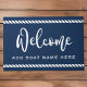 ダークブルーまたはカスタムカラー歓迎ドアマットは、文字のボート名が上下に白いロープと書き物のフォントでエレガントはカスタム「歓迎」のを備えた縁ど。