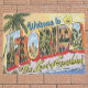 Welcome to Floridaフロリダのヴィンテージとレトロなフォントで埋め尽くされた大きな文字を持つ古いポストカードに基づくサンシャインの土地スタイル。