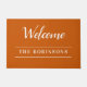エレガントカスタムタイポグラフィの特徴は白いスクリプトので燃えたオレンジ色の背景に"ようこそ"あなたの家族の姓とゲストに暖かい歓迎を提供する。季節の喜びとともに、居心地の良い暖かい秋をお祈り。楽しむ!