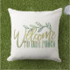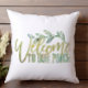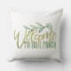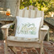 装飾用クッションはエレガント緑色の水色と金ゴールドプリントの言葉"ようこそ私たちのポーチ'前面に。背面のフローラプリントを調整。我々のZazzleストアで我々の装飾のすべてを見る!