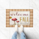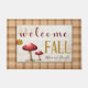 秋のtouchを追加する私たちのドアマットは、"ようこそ秋"で飾られたスクリプトフォントでオレンジの格子板と木材プリントの背景にキュート秋のキノコと葉。名前またはメッセージの追加Zazzleストアで私たちの休日の装飾をすべて表示!
