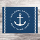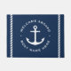 白いいかりとカスタマイズ可能な航海の文字「ウェルカムアボード」とロープで囲まれたボート名を備えたドアマ縁どット。濃い青の背景に白いデザイン。