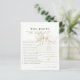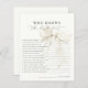 アイボリーエレガント白い弓「誰が花嫁を知っ最高のて」ゲームのカード清浄な背景にシックなスクリプトタイポグラフィを搭載。ブライダルシャワー、ウェディングシャワー、またはバチェロレッテにおもしろい、インタラクティブなtouchを追加するのに最適。特に弓をテーマにしたお祝いや白黒の画像に最適。花嫁に関する軽やかな質問に答えるゲストは、記憶に残る記念すべき存在となる。同じアイボリー弓デザイン内の一致する招待状、看板、パーティーアクセサリーと美しくコーディネート。