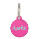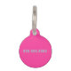ホットピンクの背景にアクアブルーのスクリプトフォントでペットの名前を載せたペット用名札で電話番号を背中に載せる。はっきりしたカラフルデザインフォントと色はデザインツールでカスタマイズ可能。