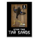 油で覆われた死んだマラードのアヒル、地球の移動装置、スカルとクロスボーンを特徴とするアヒルの山。文字読の「ストップTHE TAR SANDS」も現れる。アルベルタ州の有毒な尾の池に着陸する水鳥に災いをもたらす。この池では、極めて粘性の高い油がタールの砂(別名オイルサンド)から抽出され、恐ろしい環境影響を受ける。アルベルタのタール砂は、砂、粘土、自然のままのビチューメンを混ぜ合わせた重い油で構成されている。抽出には天然ガスを燃焼させ、十分な熱と蒸気を発生させ、砂から油を溶かす必要がある。1バレルの油を作るには5バレルの水が独身の必要である。毎日何百万ガロンもの水が、ヒ素、銅、鉛、亜鉛などの化学物質で汚染され、基本的には砂からタール砂の油(希釈ビチューメンと呼ばれる)が分離される。しかし、このプロセスの後、水は非常に汚染されているため、彼らは尾根池と呼ばれる有毒なスラッジピットに保存する必要がある。アルバータ州のアサバスカ川とその周辺の風景に向けて、汚染された水の流出は毎日300万ガロンと推定されている。タールの砂にノーと言いなさい。