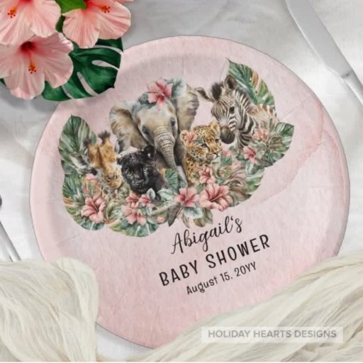 野生のサファリの甘いジャングルの赤ん坊の動物のコラージュ、キリン、ゼブラ、パンサー、タイガー、象は、この差出人住所デザインの熱帯ハイビスカスとモンステラの緑の間に静かに閉じ込められている。背景はグラデーションのピンクの水色である。休日のハートデザインによる複合デザイン。