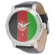 アフガニスタン国旗は縦三色で、中央に国章がある。旗の色は赤、緑、黒、白。アフガニスタン国旗の割合は2:3である。アフガニスタン国旗は2002年に採択された。現在のフラグデザインの最初の使用は1928年だった。現在のアフガニスタン国旗のデザインへの最後の変更は2004年だった。