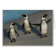3羽のろばペンギンかアフリカのペンギン-砂浜のSpheniscusのdemersus-、大きい石は、Simonsの町、西ケープ州、南アフリカ共和国浜に引き上げます
