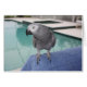彼女の青いタオルのプールサイドに立ち、太陽を楽しんでいるコンゴのアフリカ灰色のオウム! 水の緑および青の背景に対するかわいらしいスカラップで仕上げられた灰色の羽。 あなたの鳥の恋人のために完成して下さい!