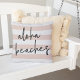 赤面ピンクストライプのの屋外ピローは、オフブラック手書きレタリングにオーバーレイ"アロハビーチ"で夏を叫ぶ。プールエリア、裏庭、またはビーチハウスに完璧な追加。