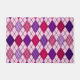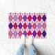 紫とピンクの色合いで色付けされた黒い線と、斜めの黒い線とが重なり合い、デザインが見た目が似たアートデコデザインを有するドアマットアーガイル。