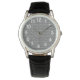 この男性用時計は、グレーのフィールドに黒で設定された迷路と直角から作られたアールデコデザインを持っている。