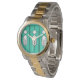 この時計は、白、黒、ターコイズのダイヤモンドと線のアートデコのステンドグラス窓デザインを持っている。