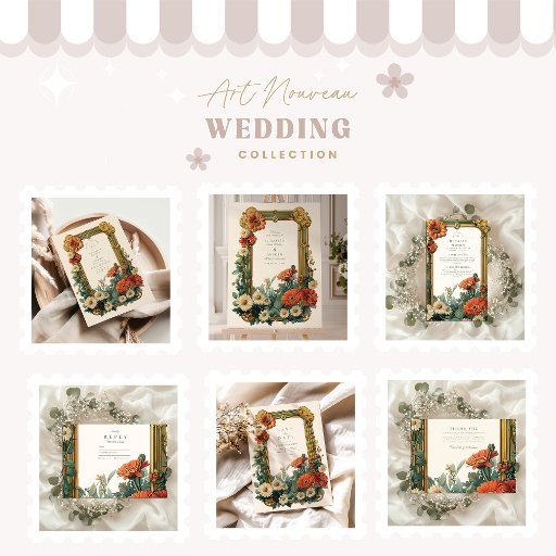 咲くデイジーとガーベラの花で飾られた黄金のアールヌーボーのフレームを特徴とする明るく楽しい結婚式招待状。アイボリー、オレンジ、赤、緑の豊かな色合いのフローラ組成物は、太陽に照らされた庭の暖かさを連想させ、ヴィンテージの優雅さと明るい魅力をブレンド。自然でロマンチックな春と夏の結婚式に理想的なテーマ。