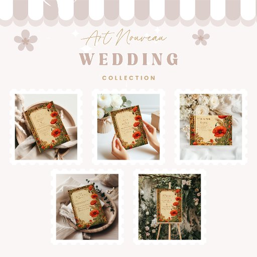 このアールヌーボーのはっきりしたデザインで声明を作る結婚。金のつる植物と植物性詳細で囲まれた印象的な赤いケシが特徴。イラストレーション華美は、ヴィンテージの優雅さと豊かな秋のトーンを組み合わせ、ロマンチックでドラマチックなお祝いを作り出す。素朴な結婚式、秋の儀式、時代を超越したフローラ作品を愛するカップルに最適。個人カスタマイズのtouchに対して、自分の詳細で簡単に。