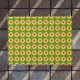 ライムグリーンの背景に小さな黄色のダリアの花の写真のイメージを特徴とし、繰り返しパターンで印刷された大きな装飾的な形式。屋内を使用するか、カバーされた入口領域で使用する。素敵なフローラデザイン!