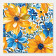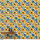 アイが黄色かわいらしの青い花の柄を背景にデザイン!