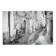イタリアの街の敷石通りの家の前に白黒で駐車したヴィンテージスクーター。