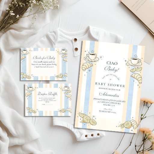 イタリアのカフェをイメージした、遊び心あふれるベビーシャワーデザイン。手描きのドゥードルイラストと、柔らかな線画のディテールが特徴です。パステルカラーの縦ストライプは、パスタ、トマト、ハーブ、カフェのエレメントなどのチャーミングなフードモチーフでアクセントをつけ、モダンな地中海スタイルを演出。ゆったりとしたレイアウトと、あたたかな色調、 whimsicalなイラストが、このデザインを、ヨーロッパ風のスタイリッシュでリラックスしたベビーシャワーにぴったりなものにしています。