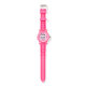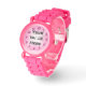 このカスタマイズ製品には、上に示すように独自の背景画像または写真をアップロードする。半透明なカスタムバラ色の数字(20%の透き)を持つテンプレートを見て、あなたの背景画像や写真に素敵な色のアクセントを加える。ドロップシ与えャドウこの平らなプリントタイムピースの数字とエンボス、ほぼ3D外観。このデザインは特にパステルやテーマガーリーの背景によく合う。ここに示すようにカラーコーディネートされたピンクバンドと組み合わせると、子供や10代クールの若者のための時計となる。