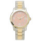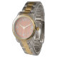 この女性の時計は、オレンジのフィールドに緑、青、紫の線に分割された円のイースターデザインを持っている。