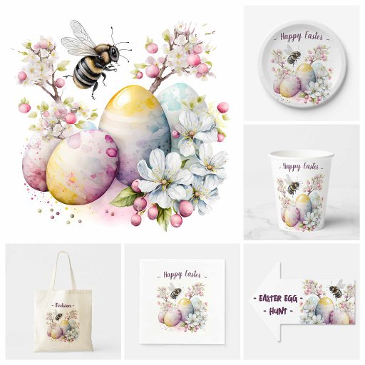 復活祭紙カップ花と復活祭の卵を持つミツバチをフィーチャー。カスタマイズ。